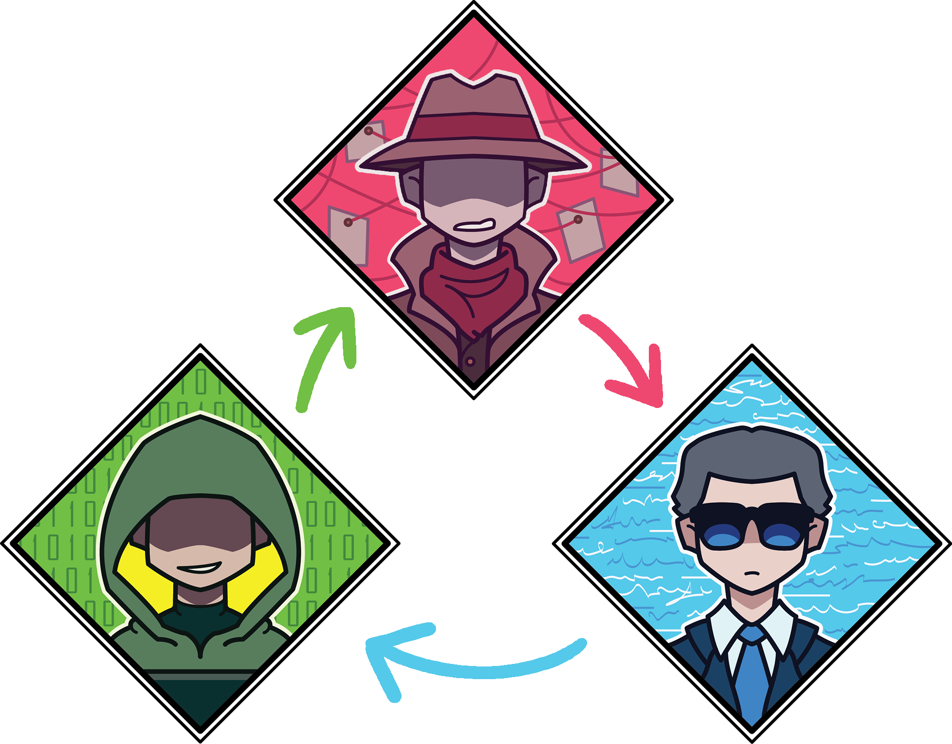 Hacker beats Detective. Detective beats Spy. Spy beats Hacker.